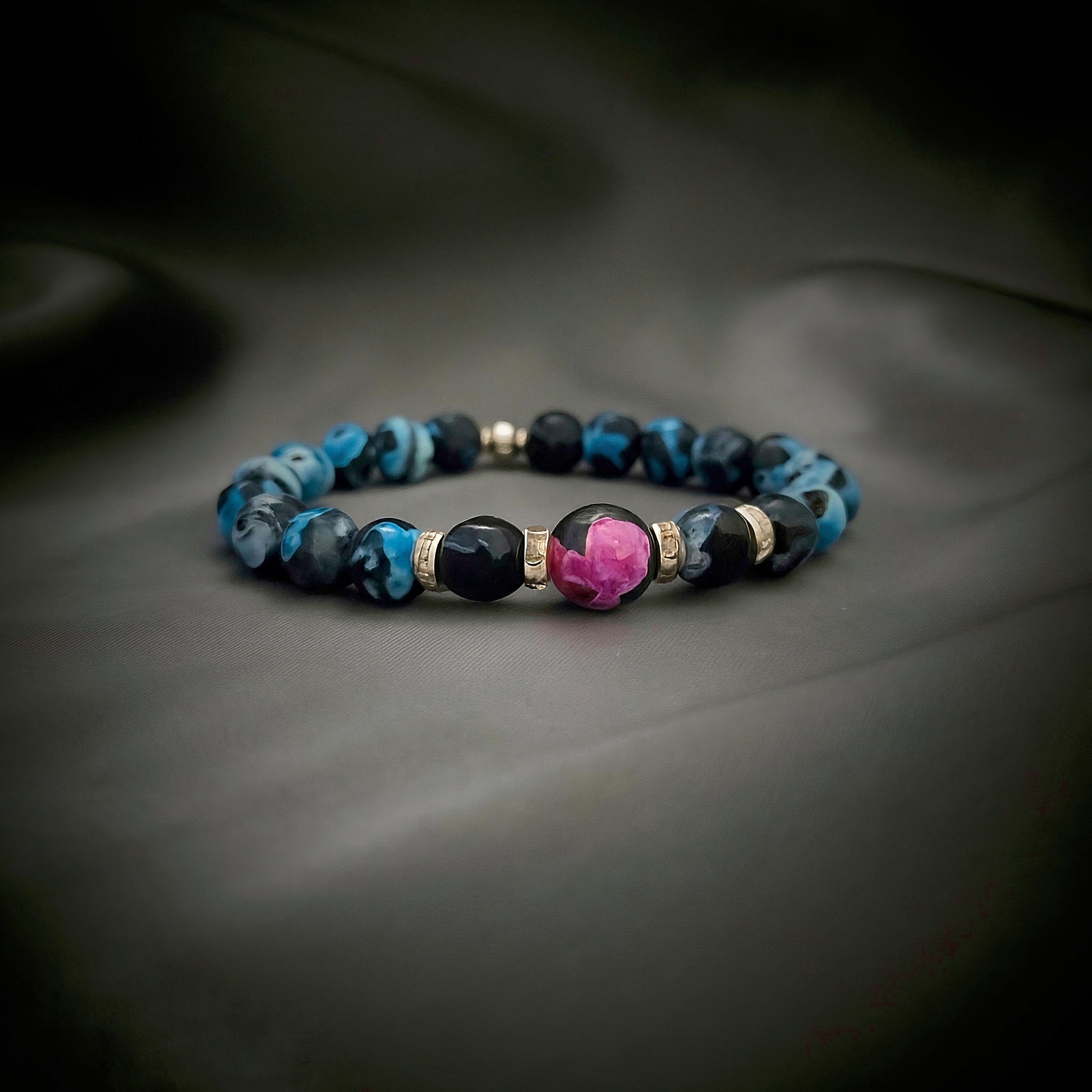 "Born from flame, forged in shadows — the Black & Blue Fire Agate bracelet ignites your energy with fierce calm."