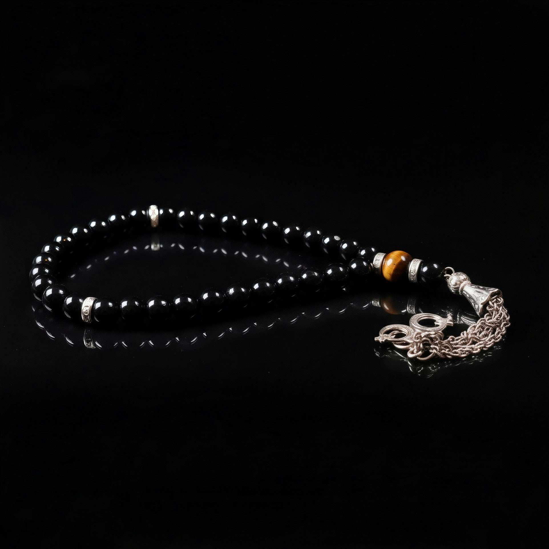 Minimal. Powerful. Timeless. Black Onyx tasbih prayer bead finished with a Tiger Eye stone for grounded elegance and spiritual presence.